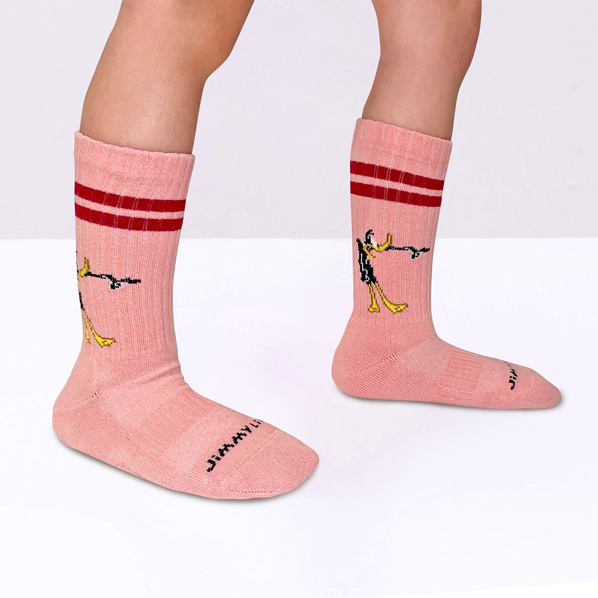 Calcetines Athletic color rosa para niños con dos rayas rojas de estilo retro y los personajes de Looney Tunes, Bugs Bunny y el Pato Lucas (Daffy Duck), decorando el tobillo.