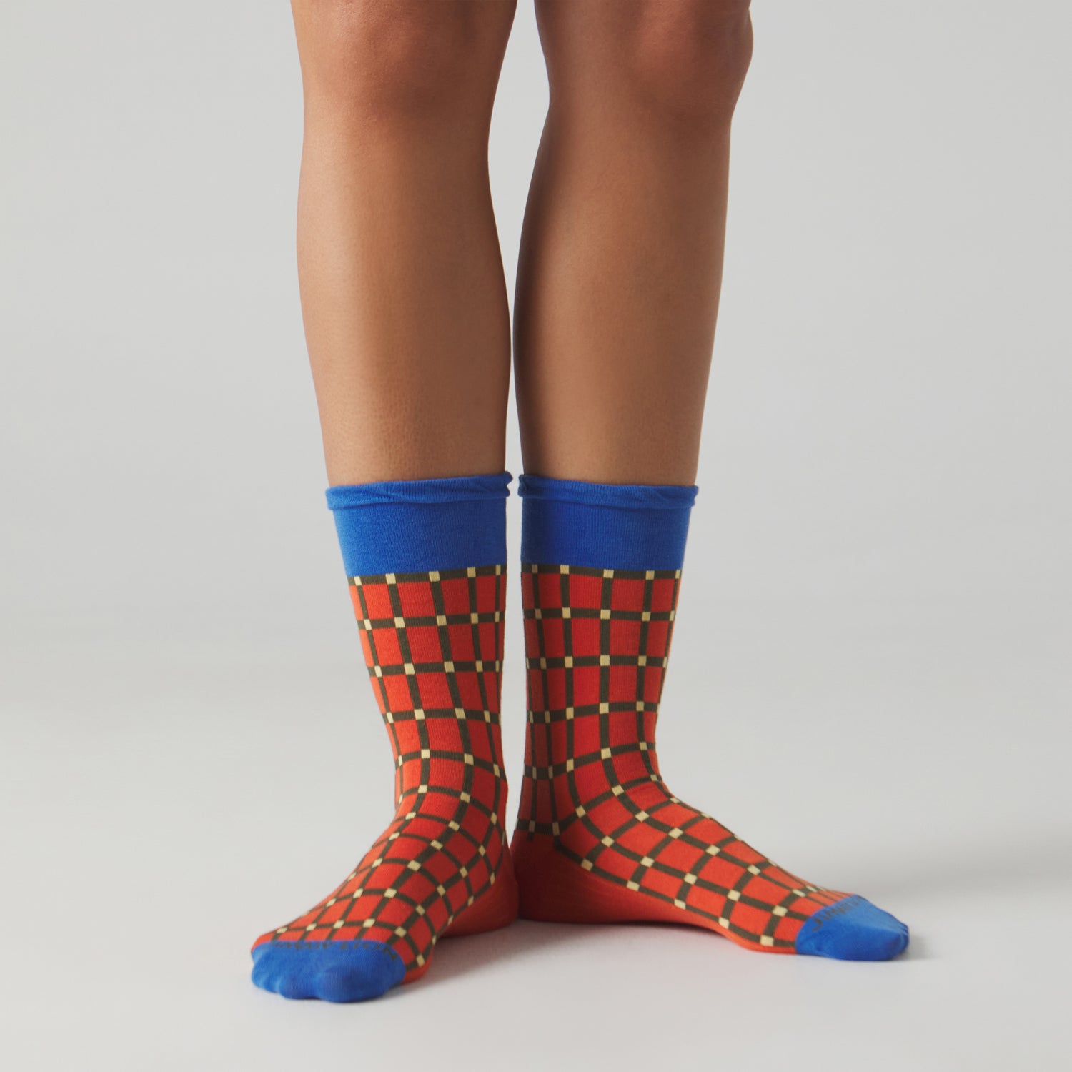 Swedish multidisciplinary artist Evelina Kroon brings her distinctive style to the Evelina Kroon Orange Pattern design — an original and vibrant pair of socks. In her own words: “What I hope to evoke through my work depends on the project, but in general, I want people to feel something quietly familiar.” Every detail of this pair was designed with care — from the textured cuff to the one-of-a-kind color combinations. Don’t miss out! Add a bold, colorful touch to your look with these unique quarter-length socks.